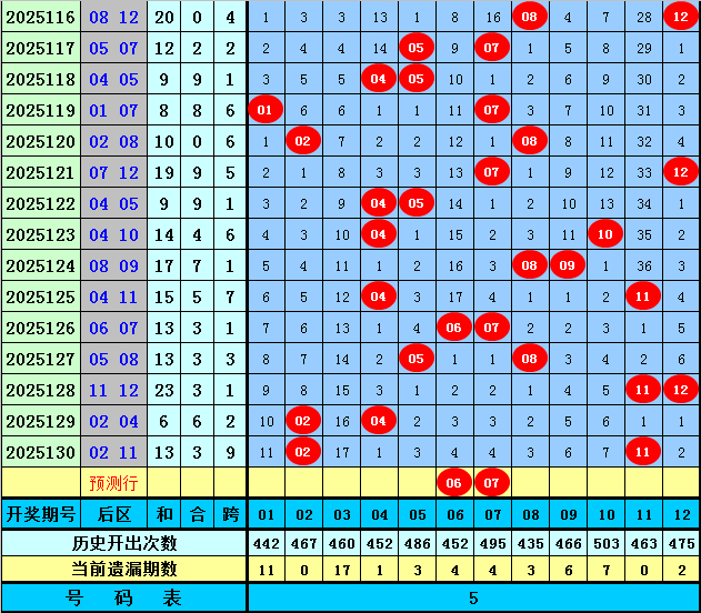 前区第二位推荐:在连续5期开奖中分别出号:08、05、06、09、13,均值为8.2,其中偶数奖号出现较少,本期适当关注偶数号码回补,参考号码12。